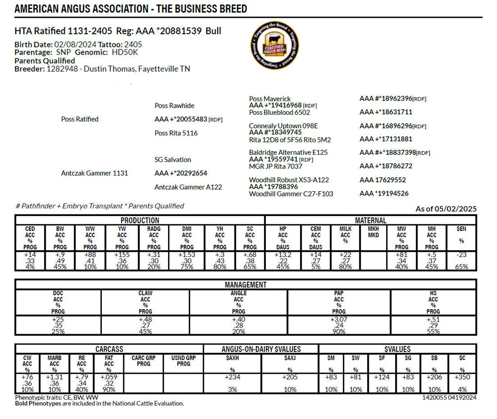 Offering a STOUT POSS RATIFIED Son!  "2405" boasts Top 4% in Calving Ease & $Combined and Top 5% CEM & Top 10% Weaning Weight, Yearling Weight, Carcass Weight, Marbling, $Maternal, $Wean, $Feedlot, $Grid & $Beef.